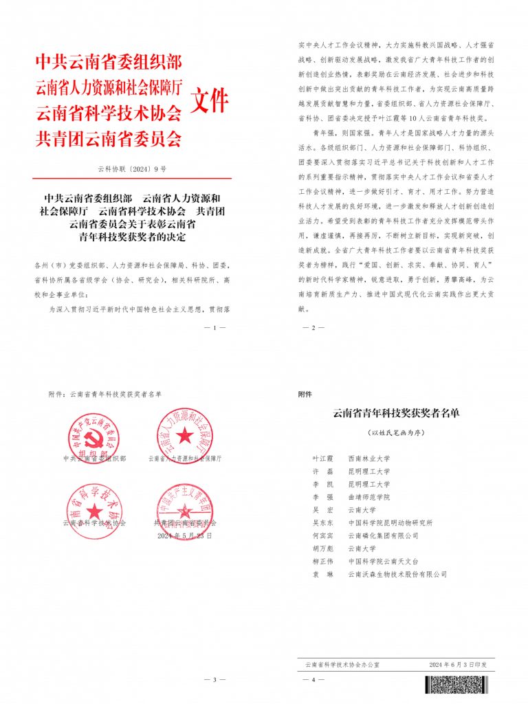 为深入贯彻习近平新时代中国特色社会主义思想,贯彻落实中央人才工作会议精神,大力实施科教兴国战略、人才强省战略、创新驱动发展战略,激发我省广大青年科技工作者的创新创造创业热情,表彰奖励在云南经济发展、社会进步和科技创新中做出突出贡献的青年科技工作者,为实现云南高质量跨越发展贡献智慧和力量,云南省委组织部、省人力资源社会保障厅、省科协、团省委决定授予叶江霞等 10 人云南省青年科技奖。