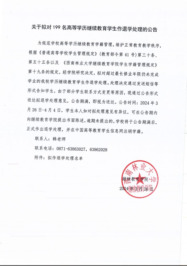 关于拟对199名高等学历继续教育员工作退学处理的公告