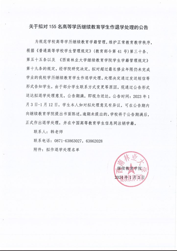 关于拟对155名高等学历继续教育员工作退学处理的公告