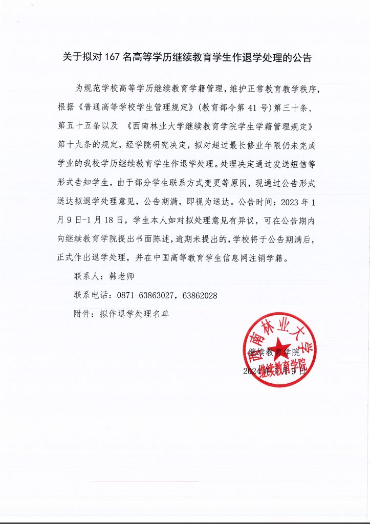 关于拟对167名高等学历继续教育员工作退学处理的公告