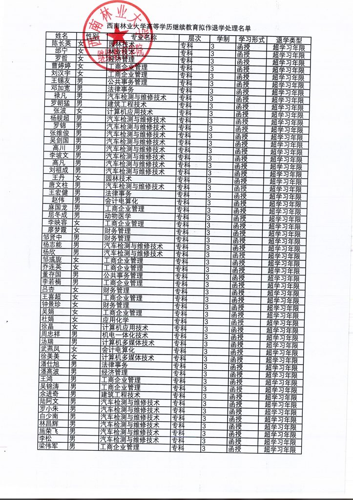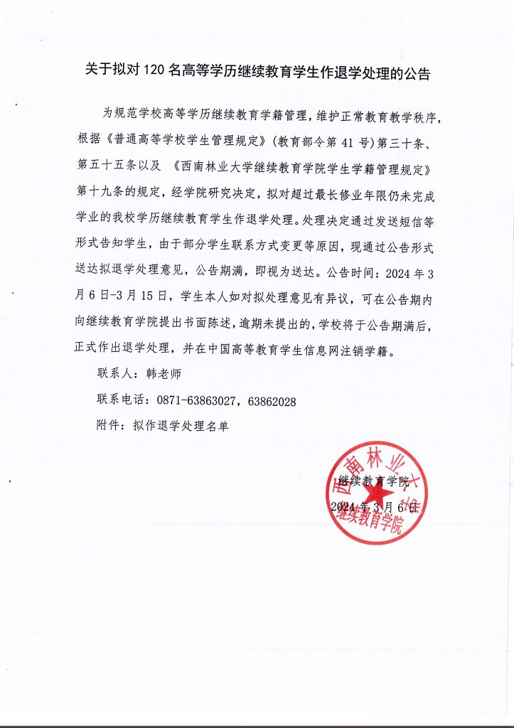 关于拟对120名高等学历继续教育员工作退学处理的公告
