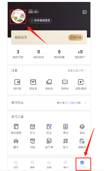 2、点击右下角“个人中心”,然后点击左上角头像。