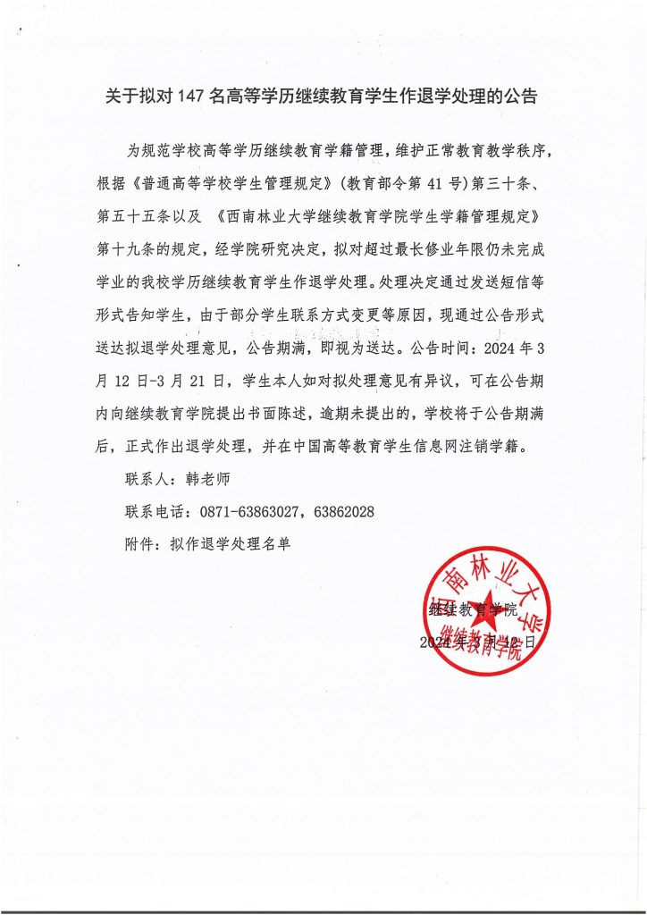 关于拟对147名高等学历继续教育员工作退学处理的公告