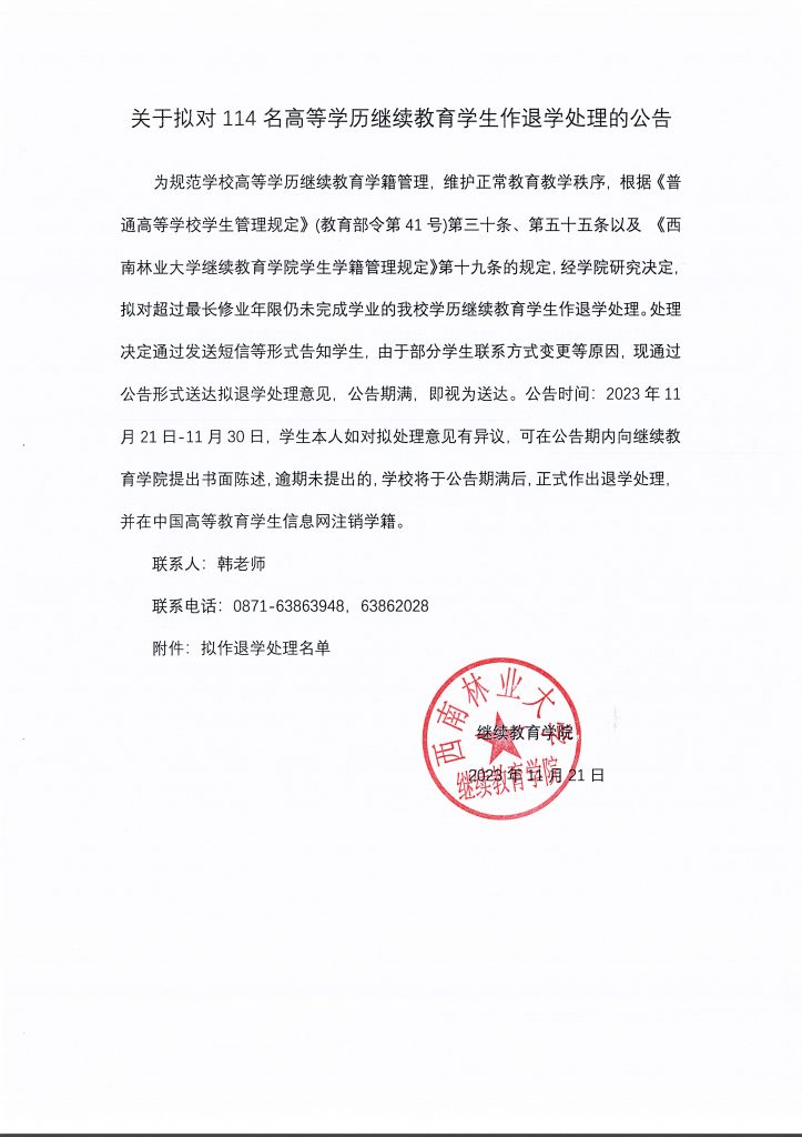 关于拟对114名高等学历继续教育员工作退学处理的公告