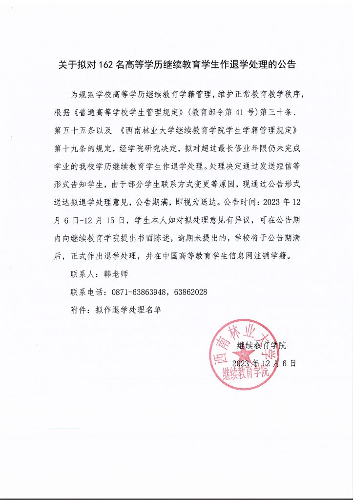 关于拟对162名高等学历继续教育员工作退学处理的公告