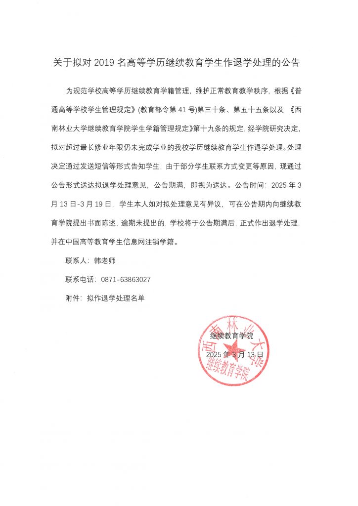 关于拟对2019名高等学历继续教育员工作退学处理的公告