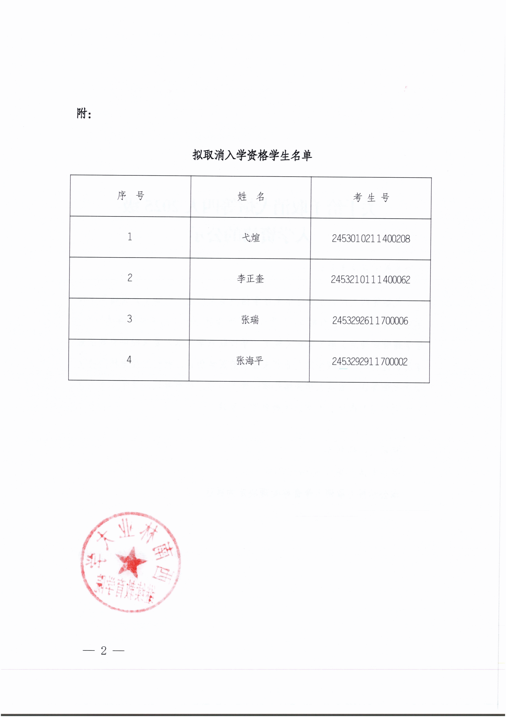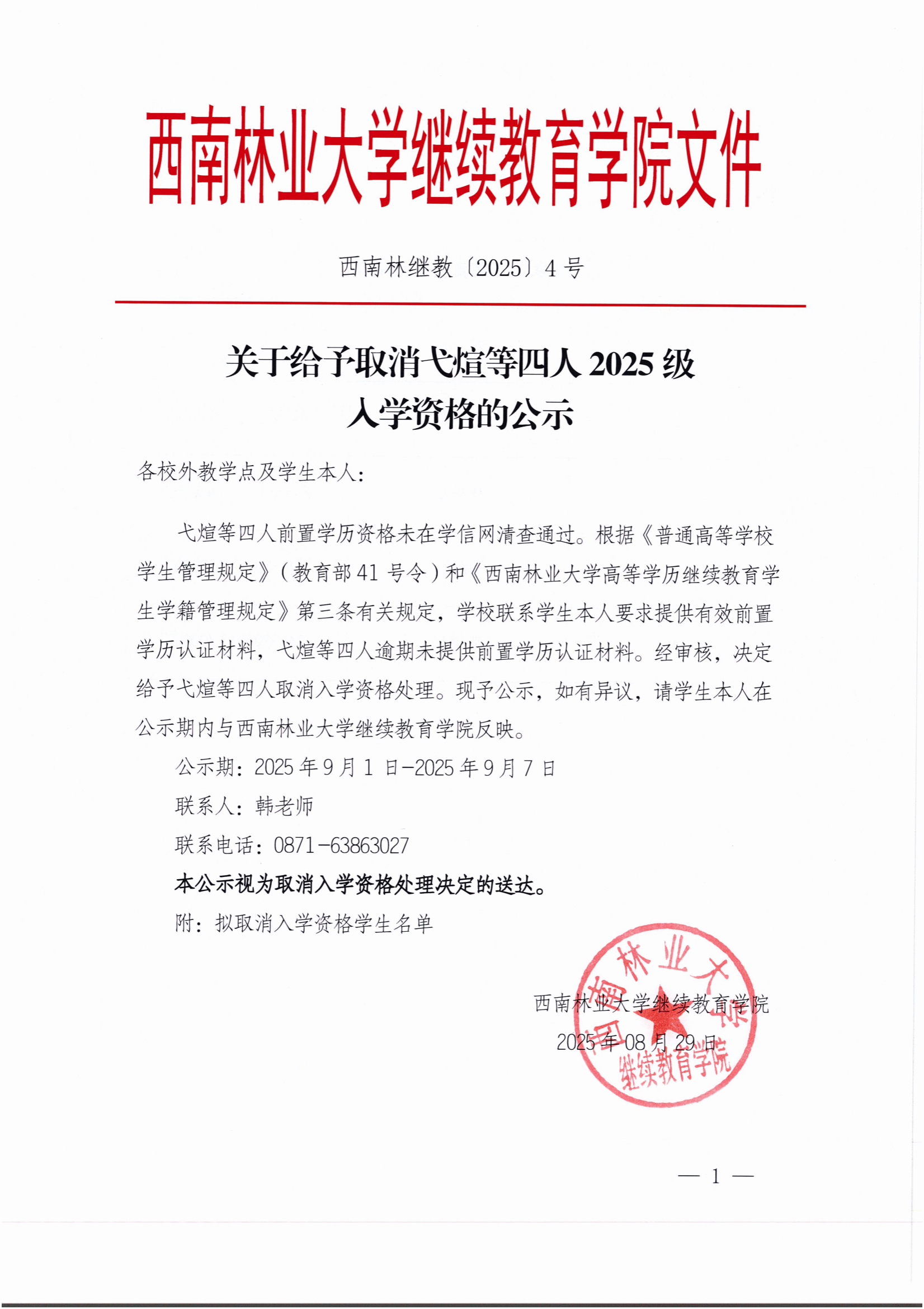 关于给予取消弋煊等四人2025级入学资格的公示