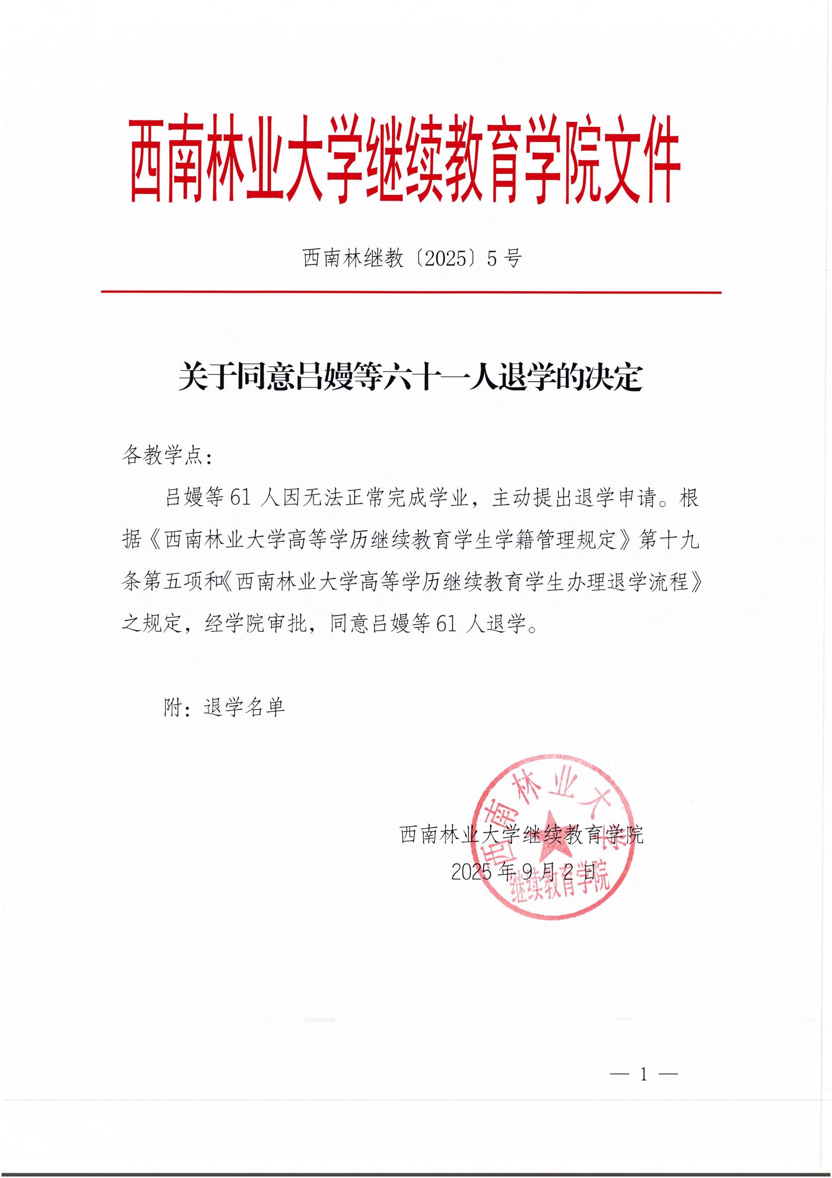 关于同意吕嫚等六十一人退学的决定